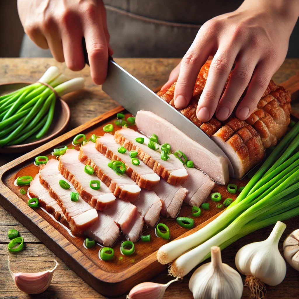 고기결을 따라 얇게 써는 것이 식감을 살리는 핵심입니다. 결을 반대로 썰면 고기가 질길 수 있으니 주의하세요.