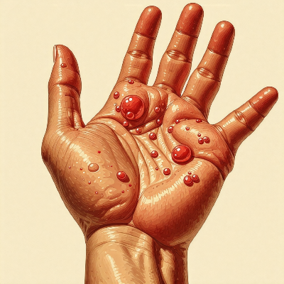발열 후 1~2일 이내에, 손과 발, 그리고 입 안에 작은 물집이나 발진이 나타나기 시작합니다. 이 발진은 일반적으로 손바닥과 발바닥, 그리고 입술, 혀, 입천장에 나타납니다. 이 물집은 빨갛고 통증을 유발할 수 있으며, 궤양으로 발전할 수 있습니다. 일부 환자들은 엉덩이, 허벅지, 팔 등에도 발진이 나타날 수 있습니다.