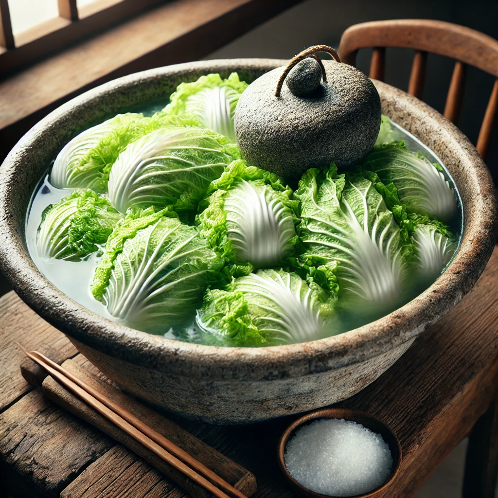 - 물에 담그기: 소금을 뿌린 배추를 큰 용기에 넣고 물을 부어 배추가 잠길 수 있도록 합니다. 이때 물과 소금이 잘 섞이도록 가볍게 저어줍니다.