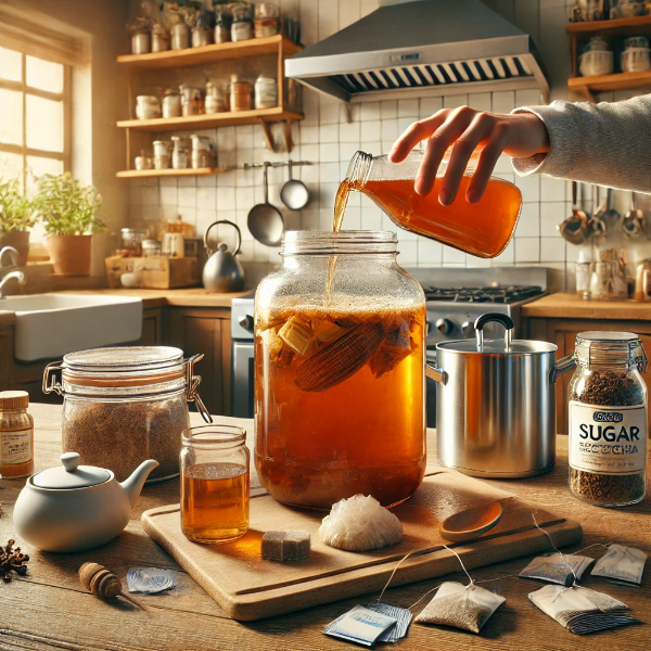 - 스타터 콤부차 1컵을 추가합니다. 스타터 콤부차는 발효 과정을 촉진하고, 안전한 발효 환경을 만들어줍니다.
