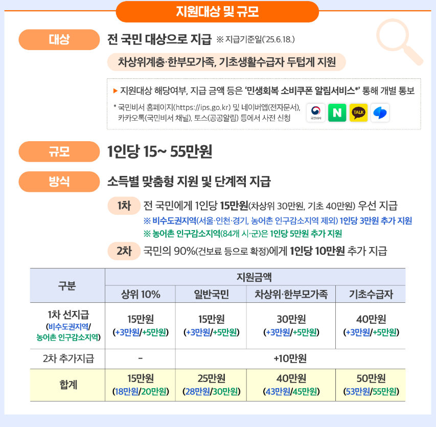 이번 민생회복 소비쿠폰은 전 국민을 대상으로 차등 지급됩니다. 소득 수준 및 거주 지역에 따라 금액이 달라지며, 다음과 같이 구분됩니다.
